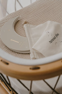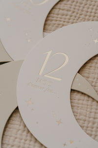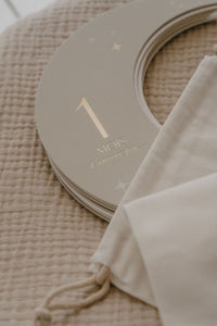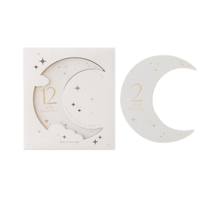 Composé de 12 cartes étapes en forme de lune avec un marquage à chaud doré et un pochon de rangement, ce coffret vous permettra de prendre de superbes photos en souvenir et d’annoter au dos l'évolution de votre enfant mois après mois.